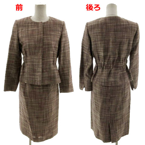 Liliane Burty スーツ フォーマル ジャケット ノーカラー ウエストゴム スカート ミディ丈 リネン混 総柄 ベージュ 茶 白 S