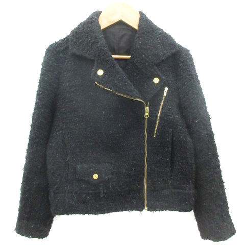 アダムエロペ Adam et Rope' ライダースジャケット ミドル丈 総裏地 ジップアップ ダブル ツイード ウール混 36 ブラック 黒 レディース