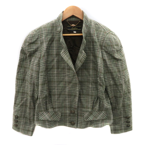 レリアン Leilian オープンカラージャケット ショート丈 総裏地 シングルボタン チェック柄 ウール 11 カーキ /YK45 レディース