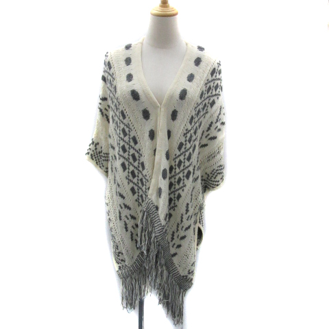 スタニングルアー STUNNING LURE ニットポンチョ 七分袖 ロング丈 Vネック 総柄 フリンジ F ライトベージュ ダークグレー /YS23 レディース