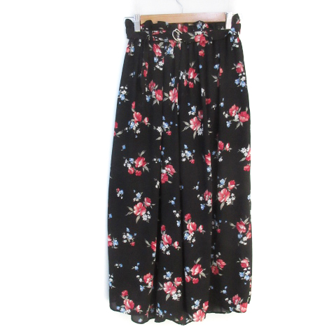 ヘザー ガウチョパンツ ワイドパンツ イージーパンツ スカーチョ 七分丈 リングベルト付き 花柄 マルチカラー F 黒 白 レディース
