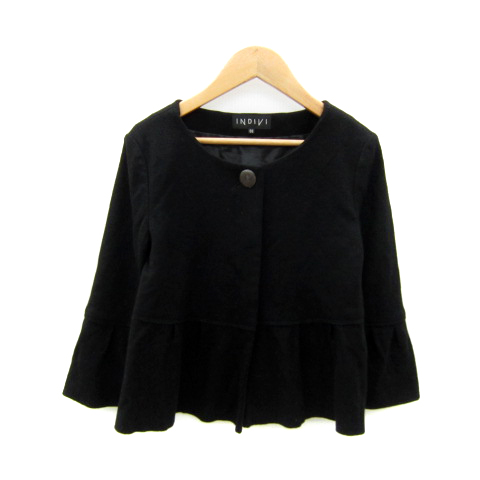 インディヴィ INDIVI ノーカラージャケット ミドル丈 七分袖 無地 切替 5 XXS 黒 ブラック /SY42 レディース