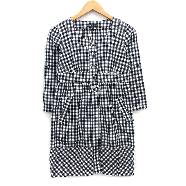 コフィ コレクト KOFI COLLECT チュニック シャツワンピ ギンガムチェック 柄 ワイド袖 七分袖 丸首 コットン 綿 M 黒 白 /HT23 レディース