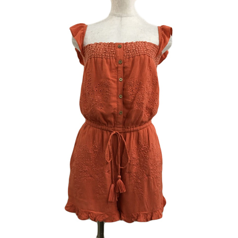 アメリカンイーグル オールインワン サロペット ショート レース 刺繍 ギャザー フリル ウエストゴム ノースリーブ S 赤 オレンジ レッド