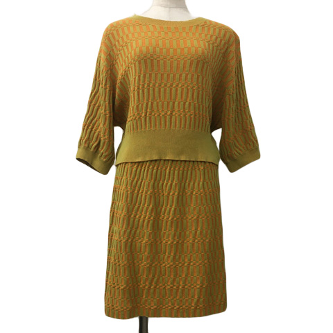 ジーナシス セットアップ セーター ニット ラウンドネック 七分袖 スカート フレア ひざ丈 ウエストゴム 総柄 F オレンジ 緑