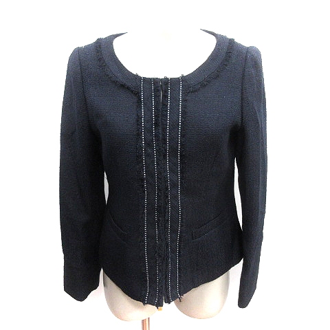 クローネ krone ノーカラージャケット フリンジ 総裏地 ツイード 11AR L 紺 ネイビー /AU レディース