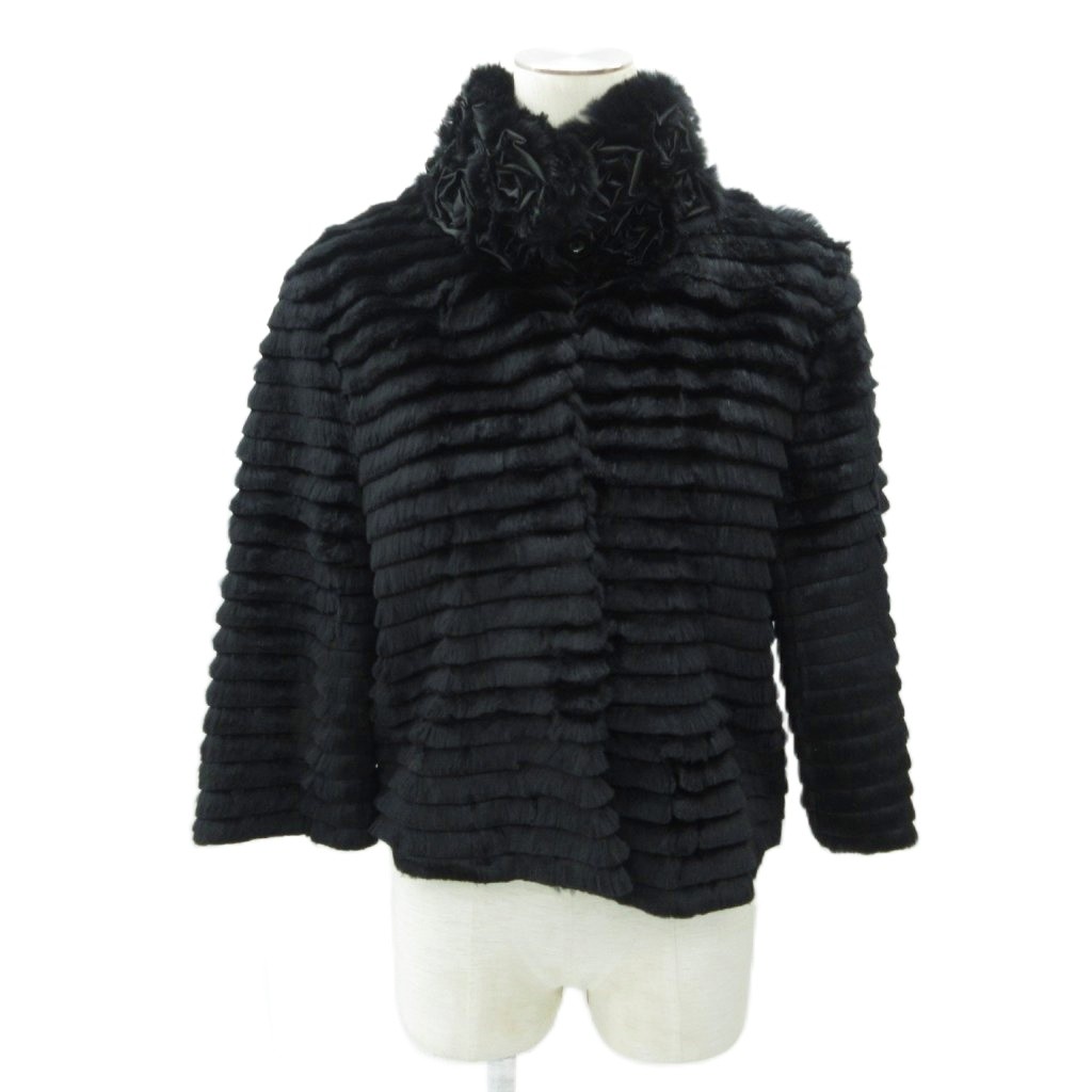 ペレッシモ PELLESSIMO ラビットファージャケット ミドル丈 M 黒 ブラック 七分袖 花モチーフ スタンドカラー /HO18 ■GY58 レディース