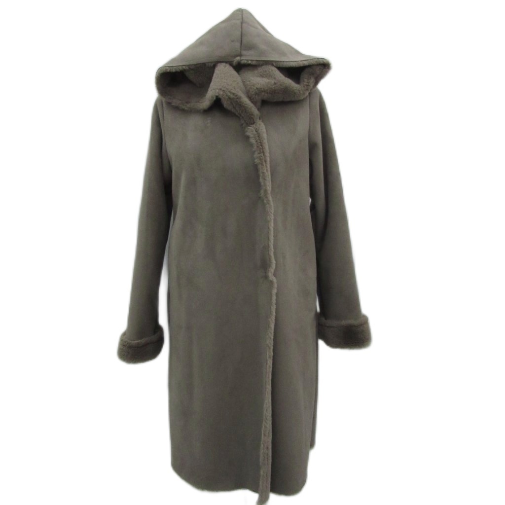 アースミュージック&エコロジー フェイクムートンコート F ブラウンベージュ フード付き ロング丈 ■GY58 レディース