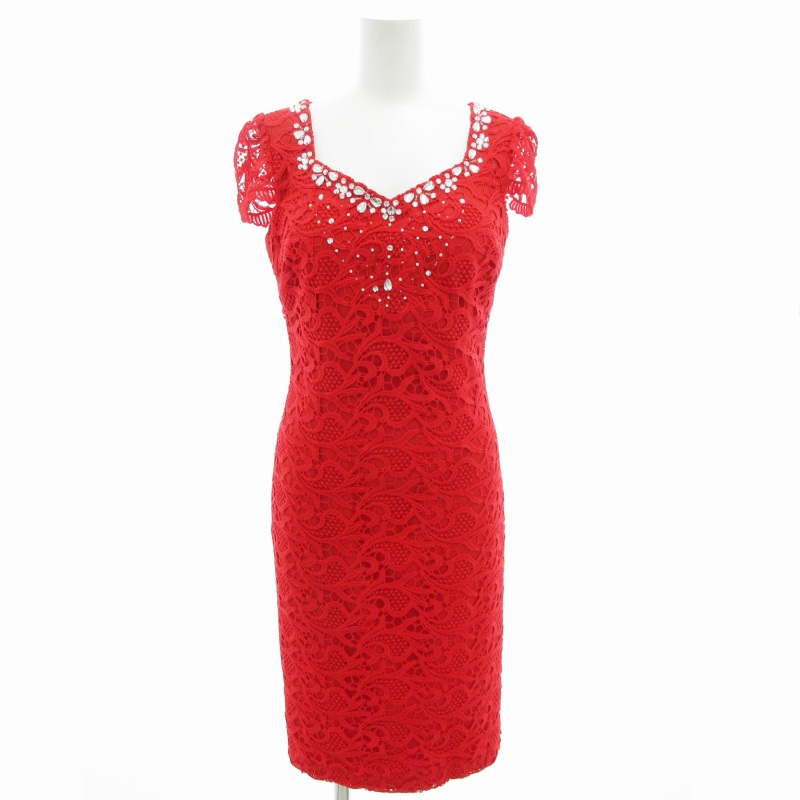 ティカ Tika カラードレス キャバドレス ワンピース 半袖 ひざ丈 レース切替 ビジュー M 赤 レッド /GV レディース