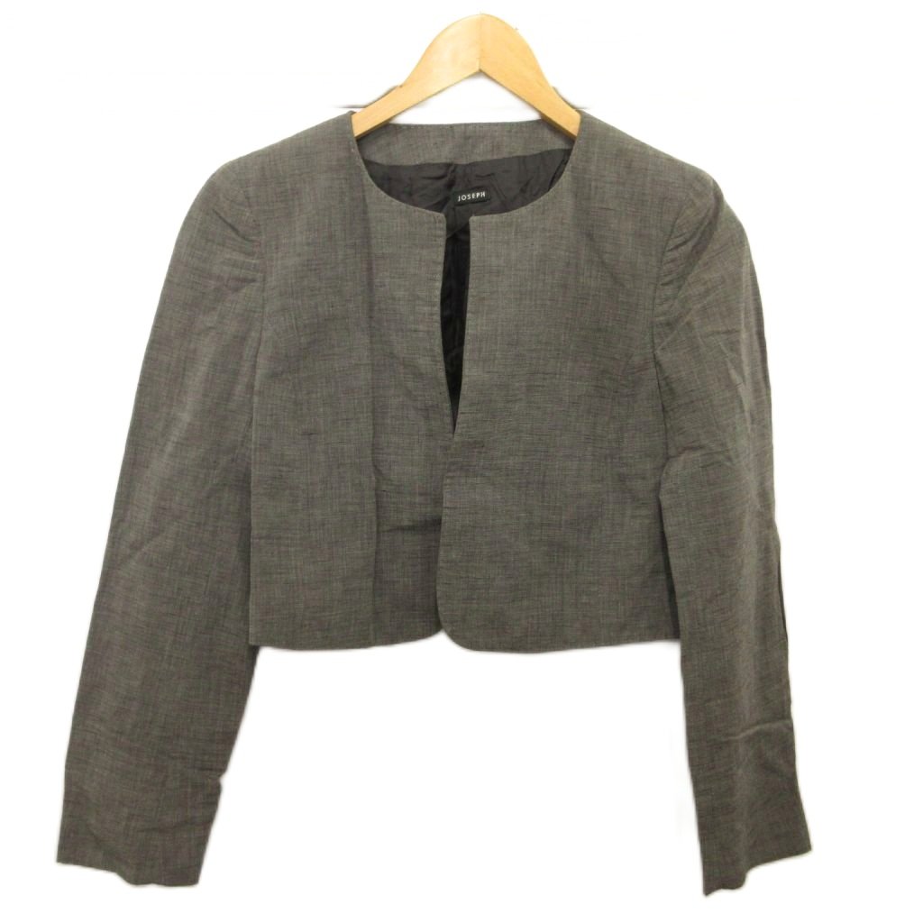 ジョセフ JOSEPH ノーカラージャケット ブレザー 短丈 クロップド エルボーパッチ 麻 リネン 牛革 36 グレー ■YHS4 レディース