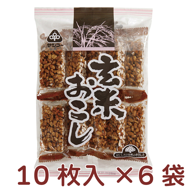 ポップさせた玄米を黒糖風味の糖蜜で固めたおこしです。サクッとした歯ごたえに仕上げました。おやつにどうぞ。 原材料:水飴(国内製造)、うるち玄米(国産)、砂糖(てん菜(国内))黒砂糖、落花生、食塩 内容量:105g 数量:6袋 販売者:サンコー