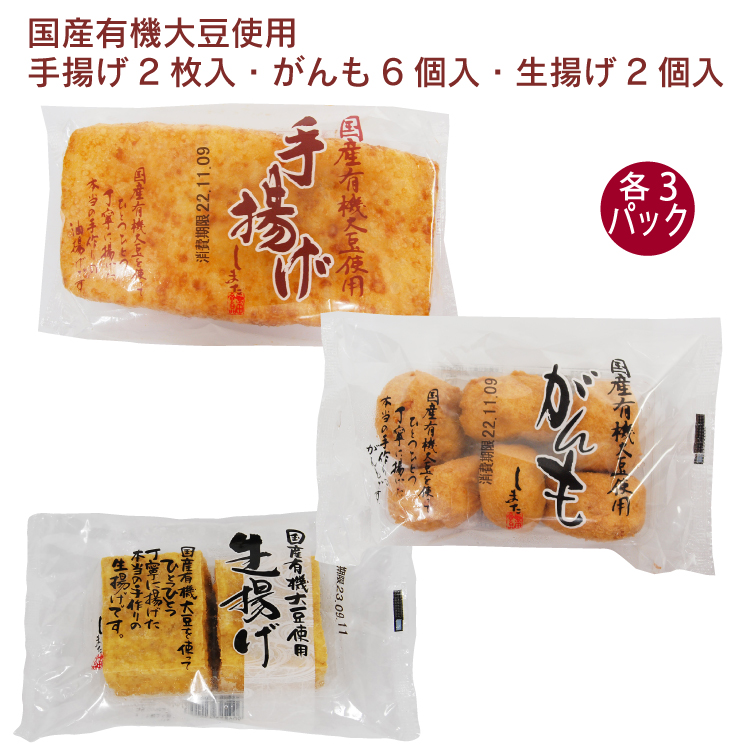 島田食品 国産有機大豆 手揚げ2枚入・がんも6個入・生揚げ2個入 各3パック(合計9パック)送料込