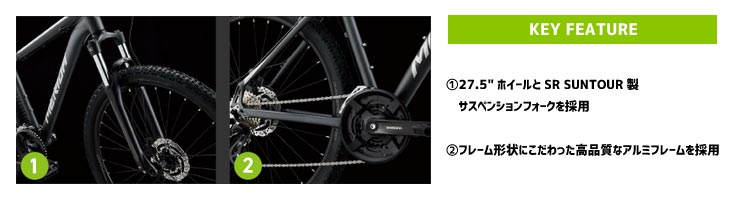 SR Suntour製フロントサスペンションや、MERIDA独自のパーツを採用した、高品質なトレイルバイク。