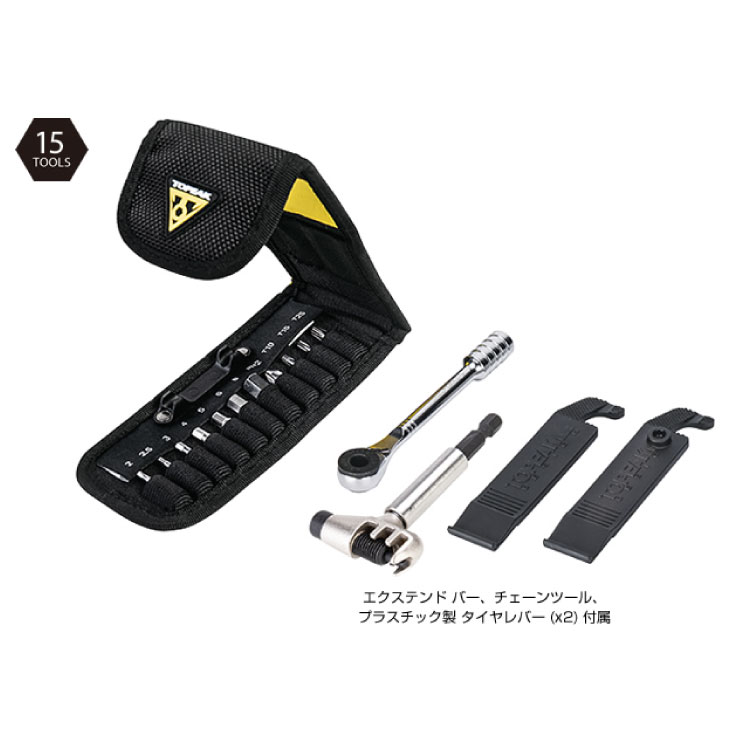小型ラチェットハンドル & ビットに、エクステンド バー、プラスチック製タイヤレバー、チェーンツールがセットになった携帯ラチェット ツール キット。