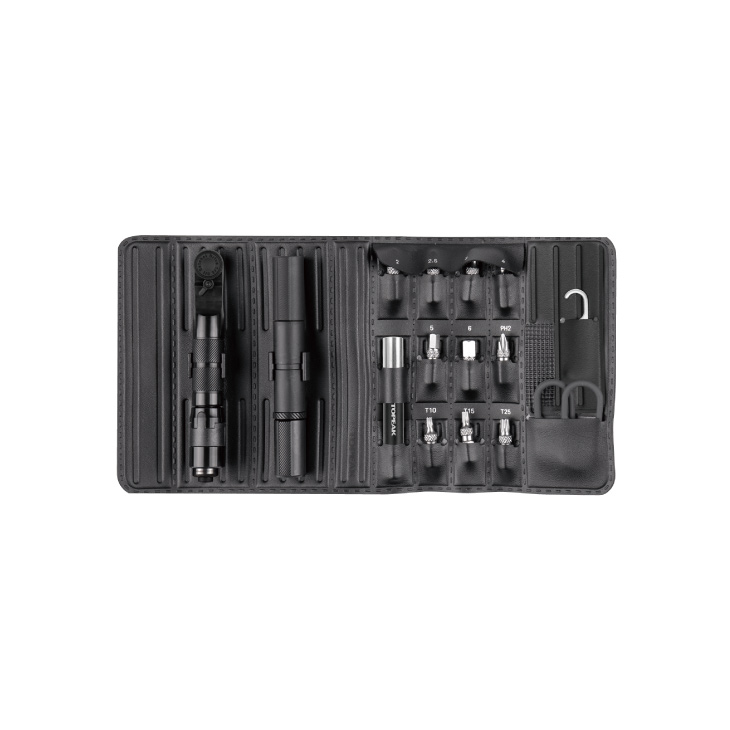 -チェーンツール一体型ラチェットレンチ、CO2 インフレーター/プラグツール/リペアプラグ、長さ70mm のスピード スリーブ ビット ホルダー、10 種類のビット、チェーンフックをナイロンケースに納めたツールキット。-