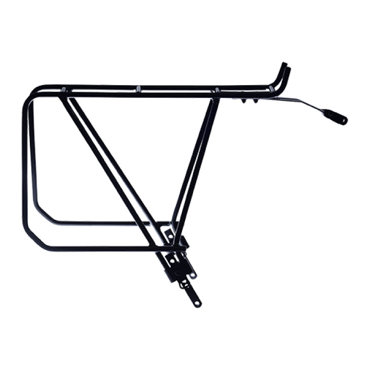 パニアバッグを10cm 後ろに装着できるリアキャリア●クロスバイクにパニアバッグを取り付けた時に困る、「かかとにバッグが当たる」「バッグがホイールに巻き込まれる」を解消する設計。
