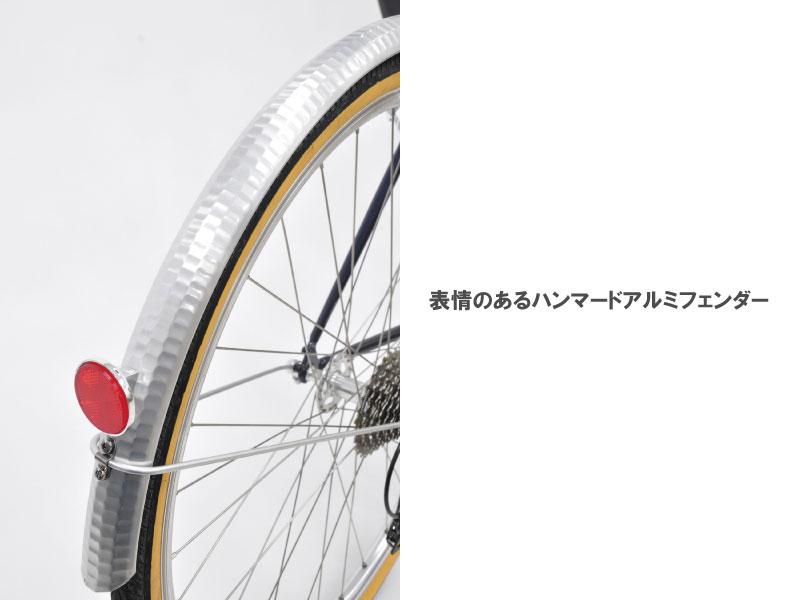 ハンマードアルミフェンダーとラージハブは高級感漂うクラシックスタイルを演出します。