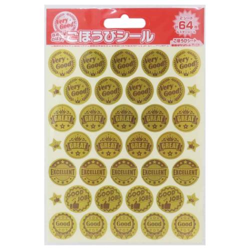 おしゃれ シール デザイン 文具 文房具 新入学 新学期こちらは貼って楽しい もらってうれしい [ごほうびシール]子供が喜ぶ、ピカピカ光るゴールド素材。ボリューム満点でたっぷり使えるごほうびシールです。直径21.5mmサイズ。コメント入りと、コメントなしのプチで、状況に合わせて使い分けできます可愛いごほうびシールいろいろあるのでお気に入りを揃えてくださいパッケージサイズ:約125x182mmセット内容:台紙1枚、シール2シート計64枚入り(直径21.5mm) デザイン/デコレーション/飾り/手帳/ステッカー バラエティ雑貨「その他シール」/