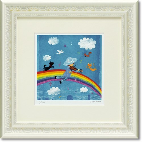 「取寄品」 お祝い ギフト おしゃれ アート インテリア 贈り物はりたつお(日本男性作家)空色ぼうしのお話「空色ぼうし」は、シンガーソングライター(故)はりまさよしの音楽をもとに、弟であるイラストレーター「はりたつお」が世界観を広げつくり出した心あたたまるオリジナルストーリーです。主人公「まーちゃん」はバイオリンを持って旅し、世界中の人々の笑顔を一つでも増やす為に美しい音色を奏でます。旅先でまーちゃんの音色に引き付けられた小さな動物達と共に、笑顔を届けに今日もどこかでバイオリンを奏でます。・サイズ:370×370mm・重量:約1.2kg・材質:樹脂フレーム/ガラス・仕様:ジグレー版画/限定300枚(エディション入り)/2mm薄クリーム色マット付「お取り寄せ」こちらの商品はお取り寄せ商品です。約3日〜10日の日数をご了承下さい。 アート作品/エディション/額/現代アート/美術 アート・額装品「版画作品」 「gift」