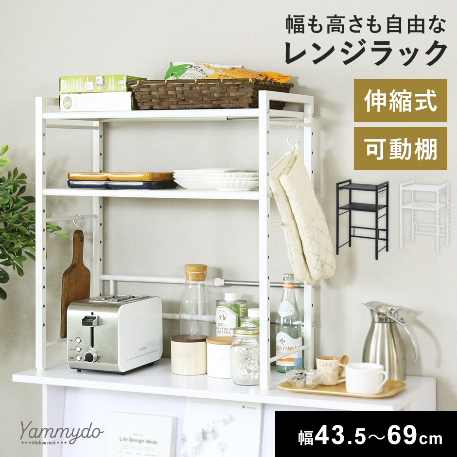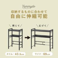 無段階で最大69cmまで伸縮可能な横幅。炊飯器や電子レンジなどの大型家電の幅に合わせて調整することで、上の空間を新たな収納スペースとして活用できます。