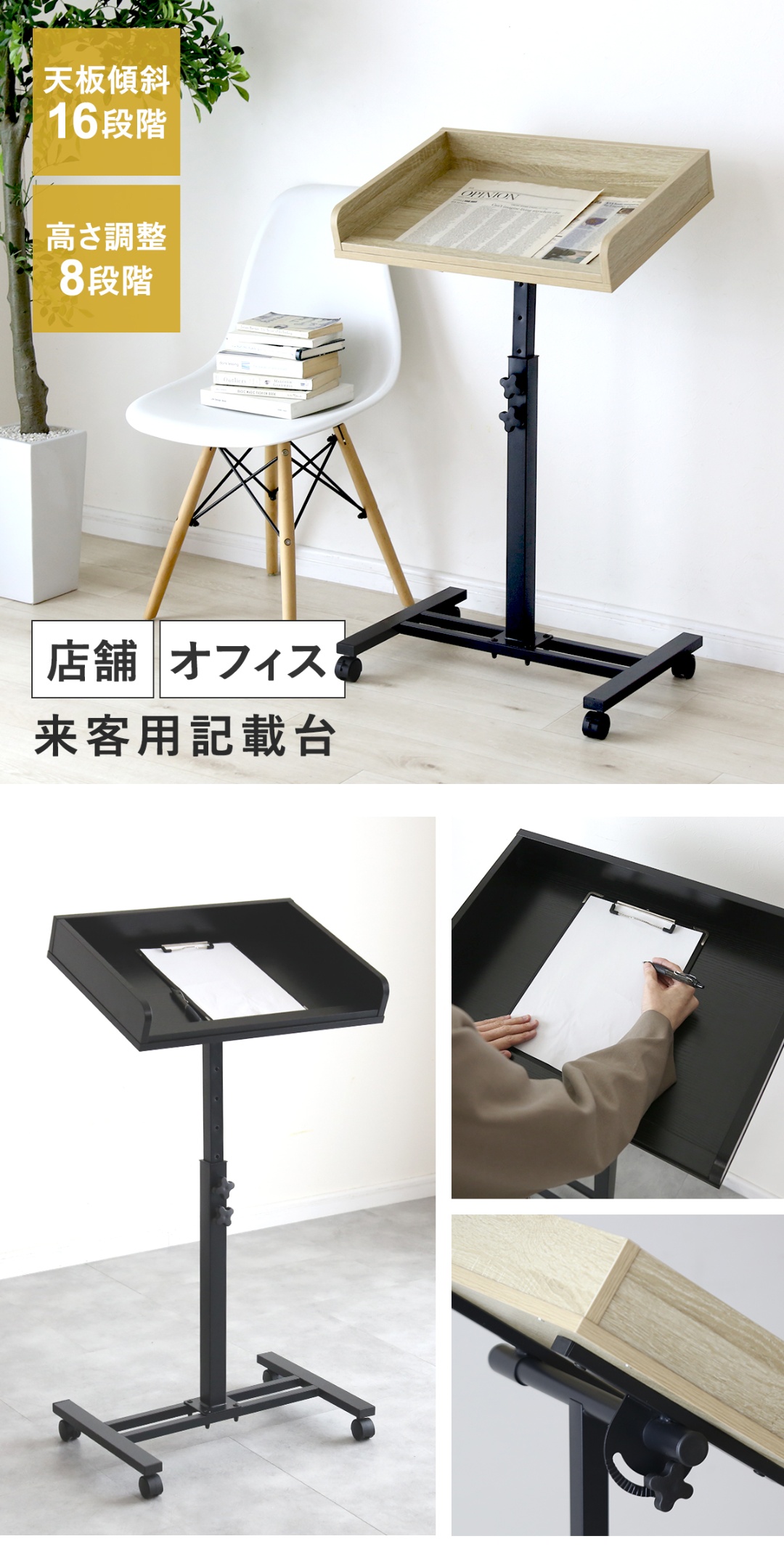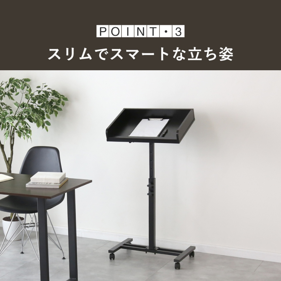 A4サイズの書類やバインダー等もすっぽり収まる余裕の広さがある天板。来客カードや申込用紙を置いてもはみ出しにくく、メニュー表や資料を広げて確認しながら記入するシーンでもストレスなく使えます。十分な奥行きと程よい傾斜が手元の視認性を高め、立ったままでも自然な姿勢で書きやすいのもポイント!