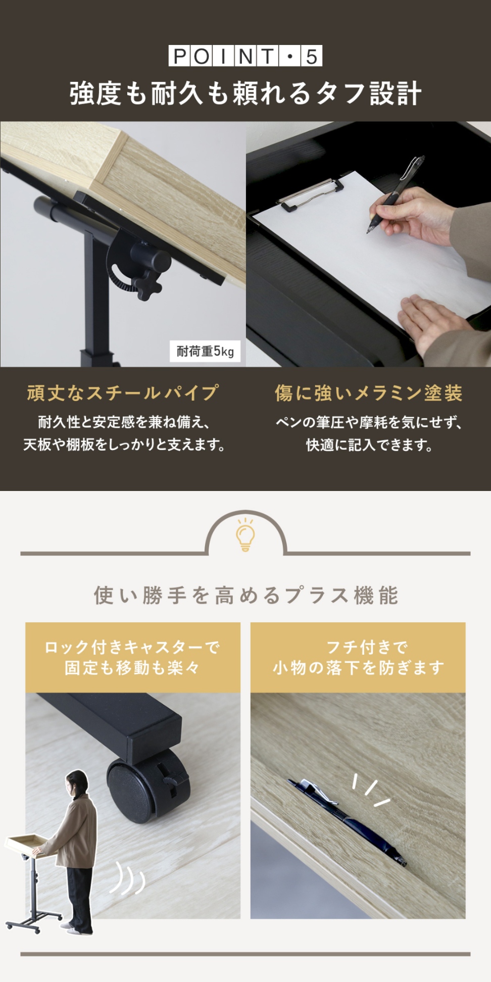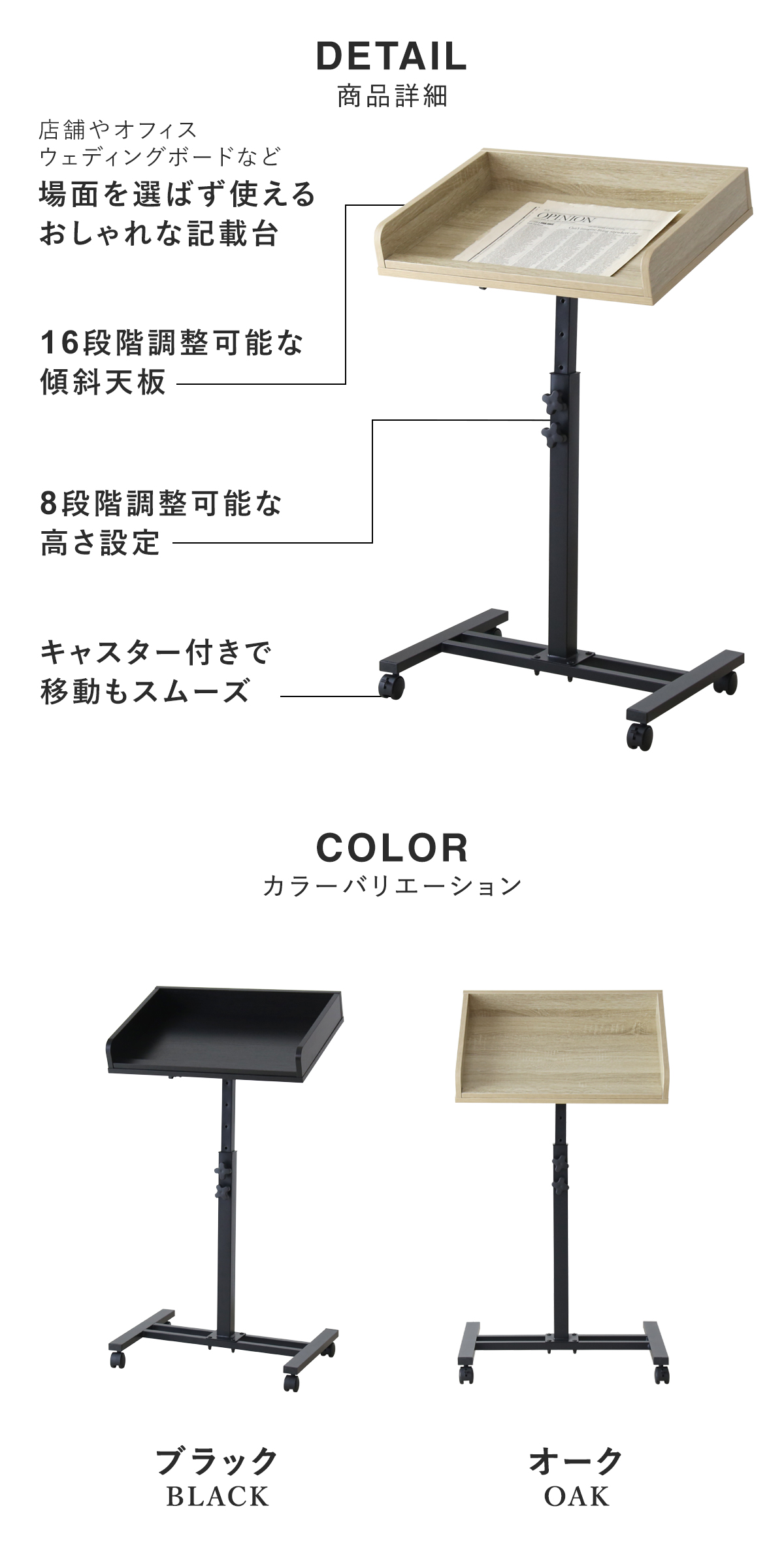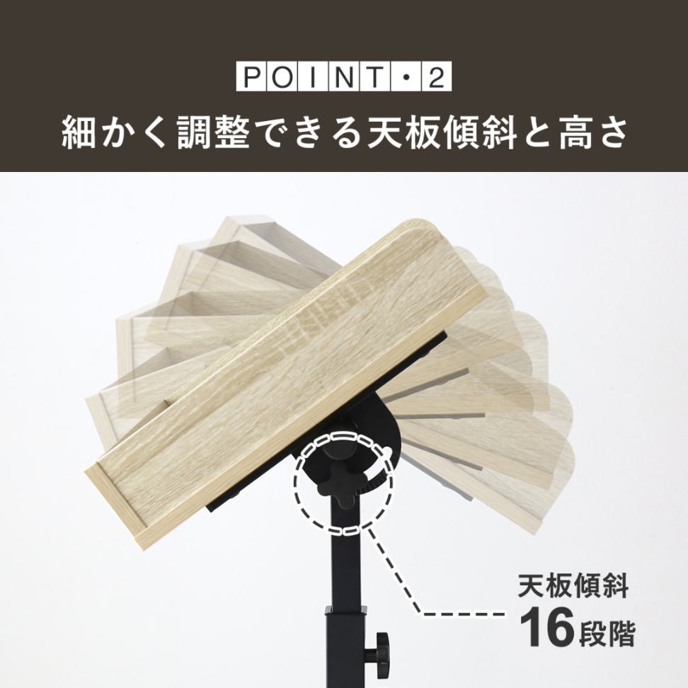 天板角度と高さが細かく調整できるのもアピールポイント。天板角度は16段階、高さは6cm間隔で8段階調整可能なので、使用する人の身長に合わせた“ちょうどいい”使い心地が実現します。