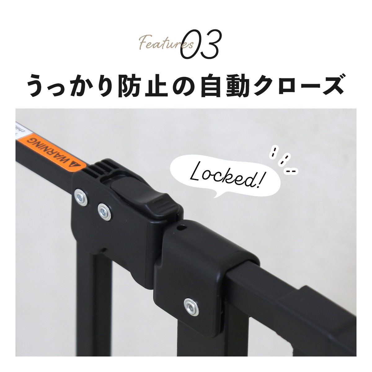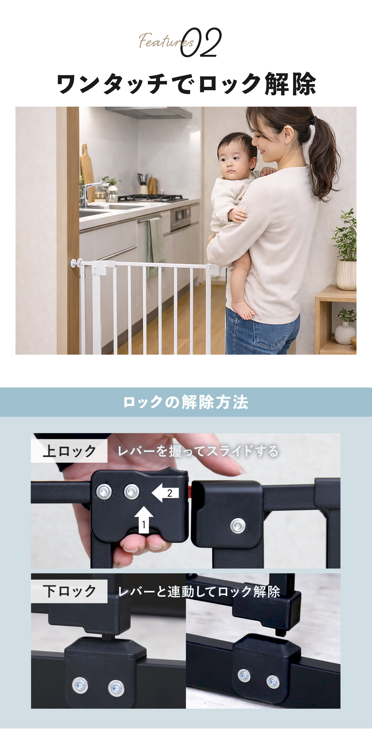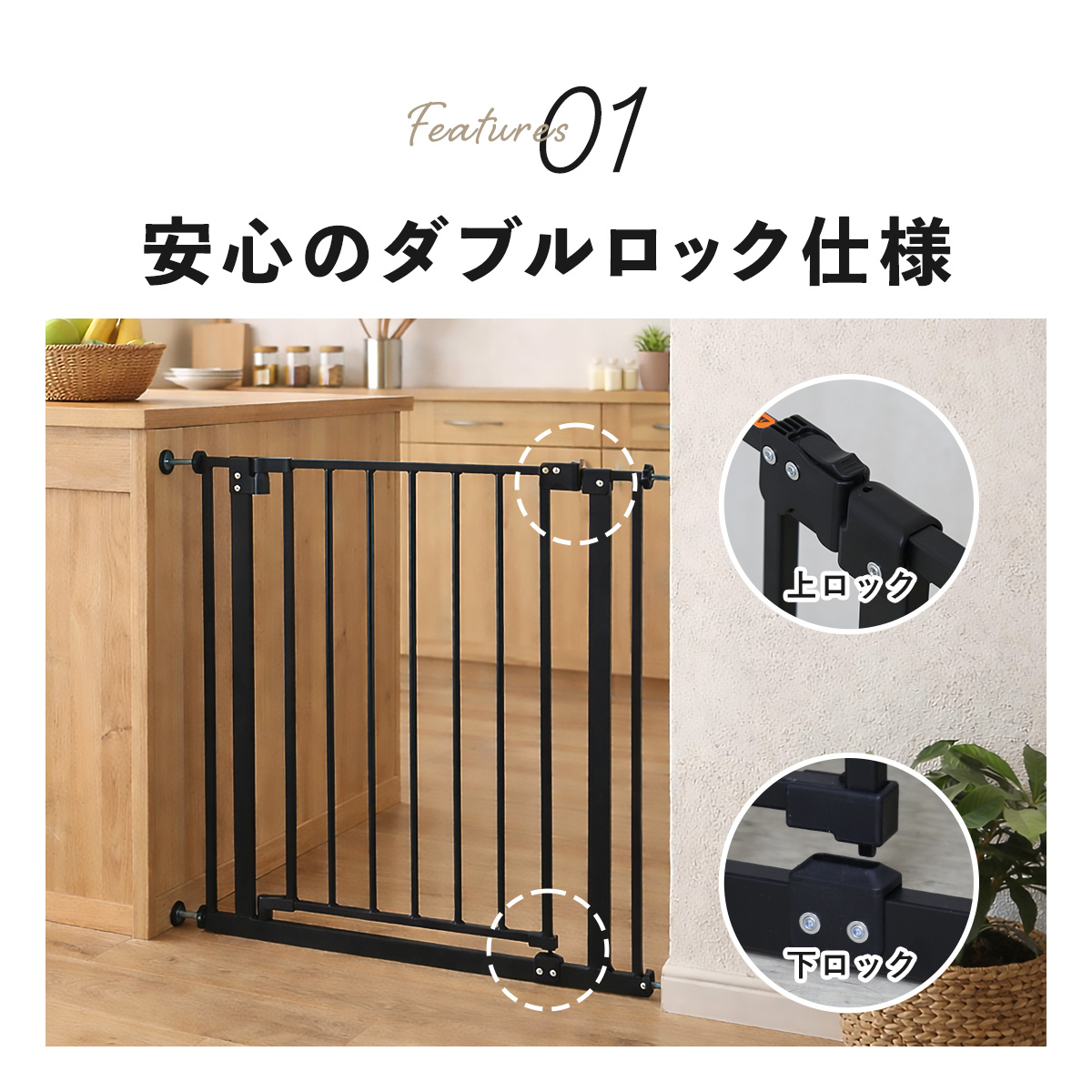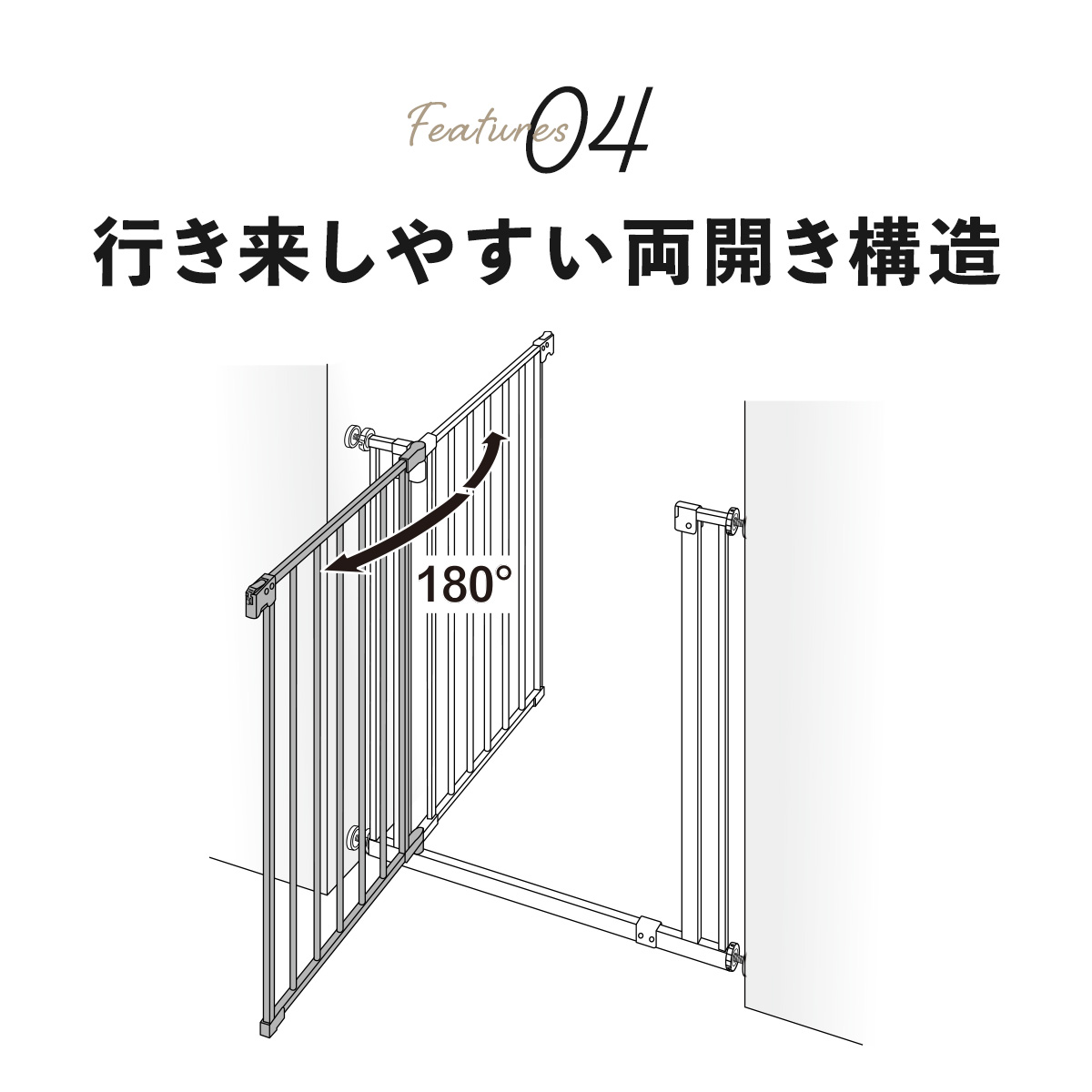 好奇心いっぱいの時期でも、不意に扉を開けてしまうリスクをしっかり抑えます。セーフティゲートに求められるのは、“もしも”を防ぐこと。ロックが二重になっていることで安全性がさらに高まり、階段や玄関など特に注意したい場所にも安心して設置できます。