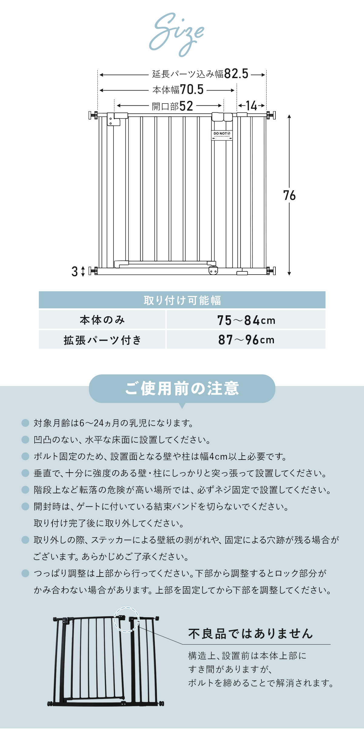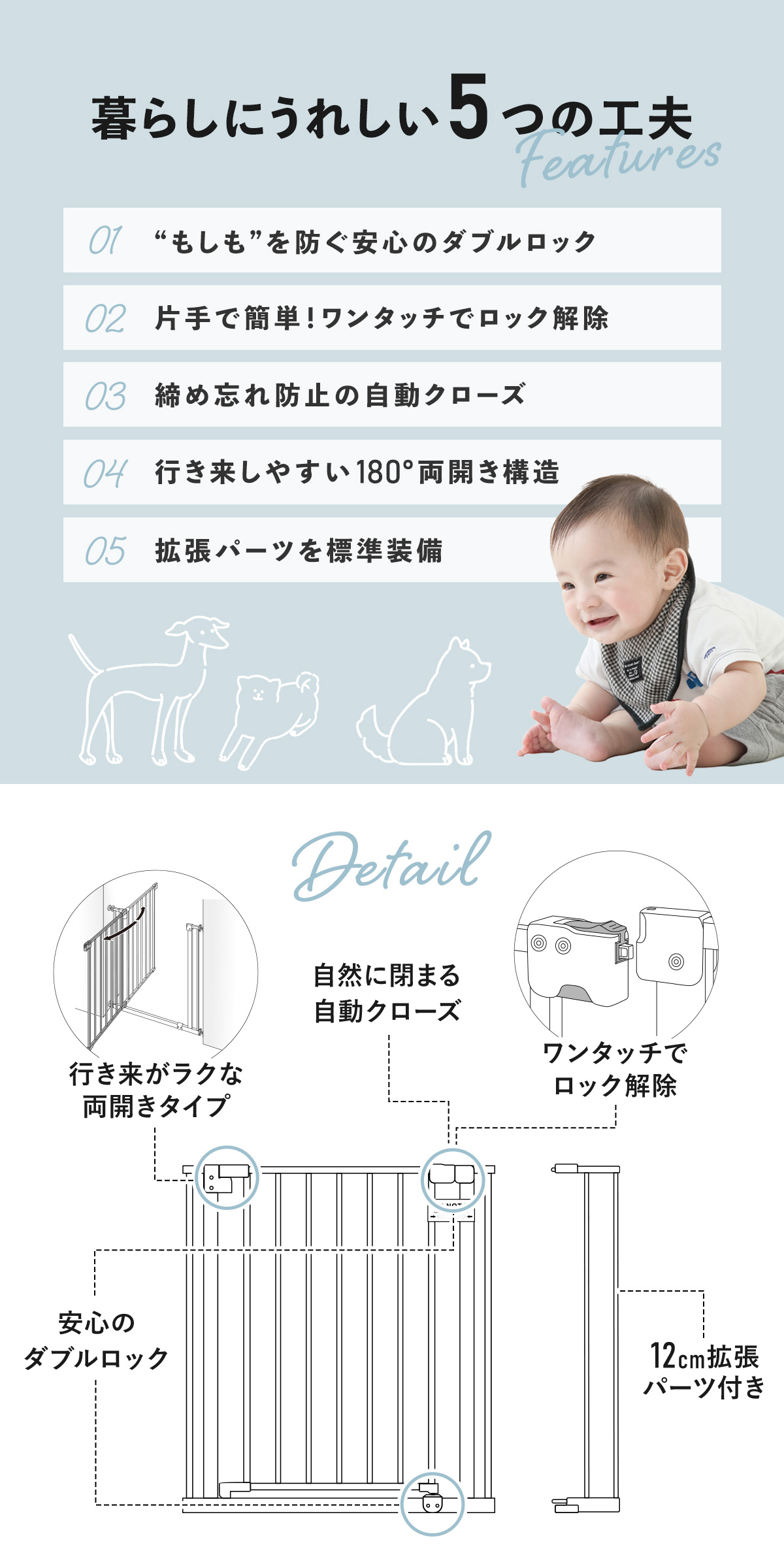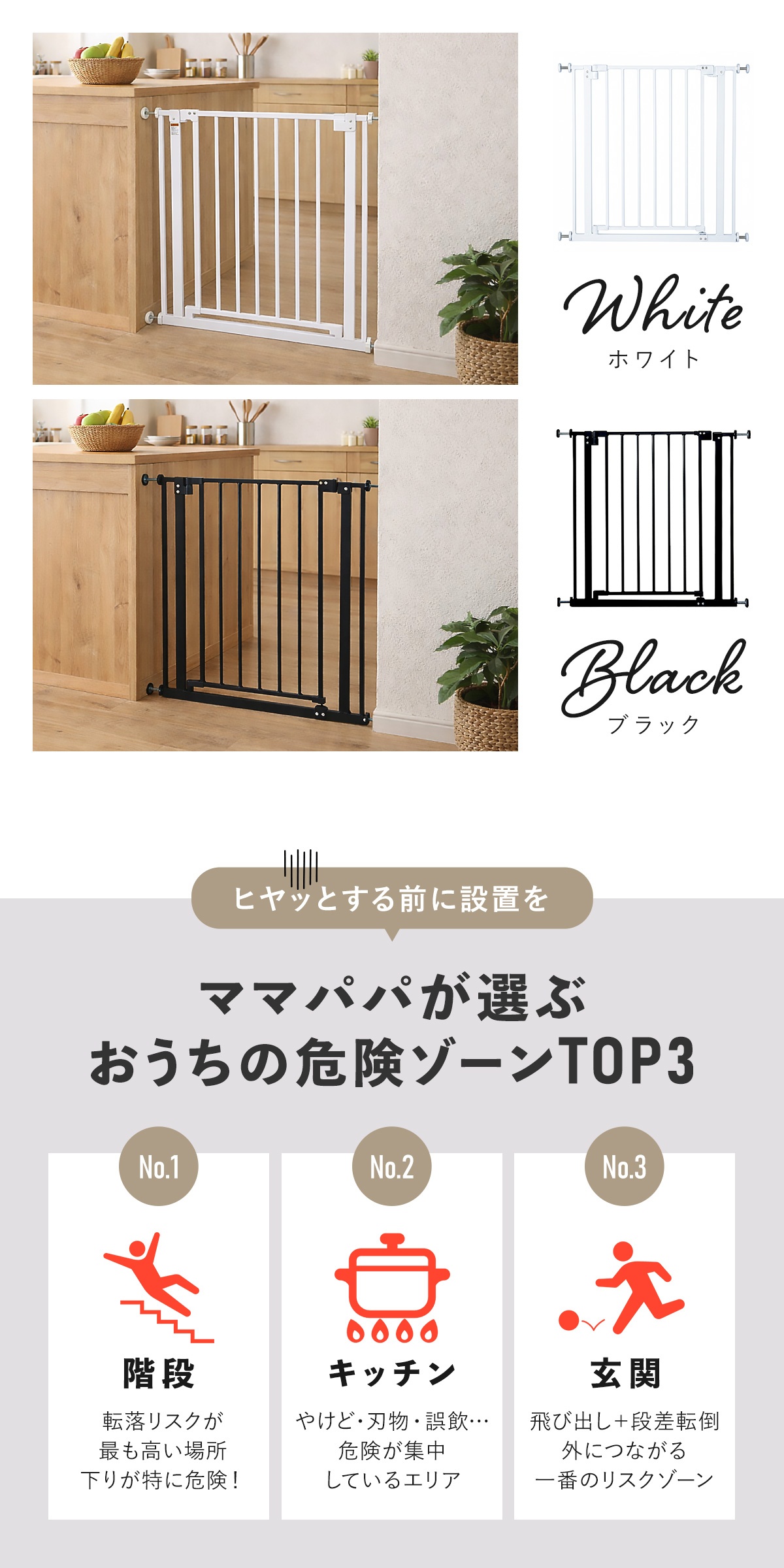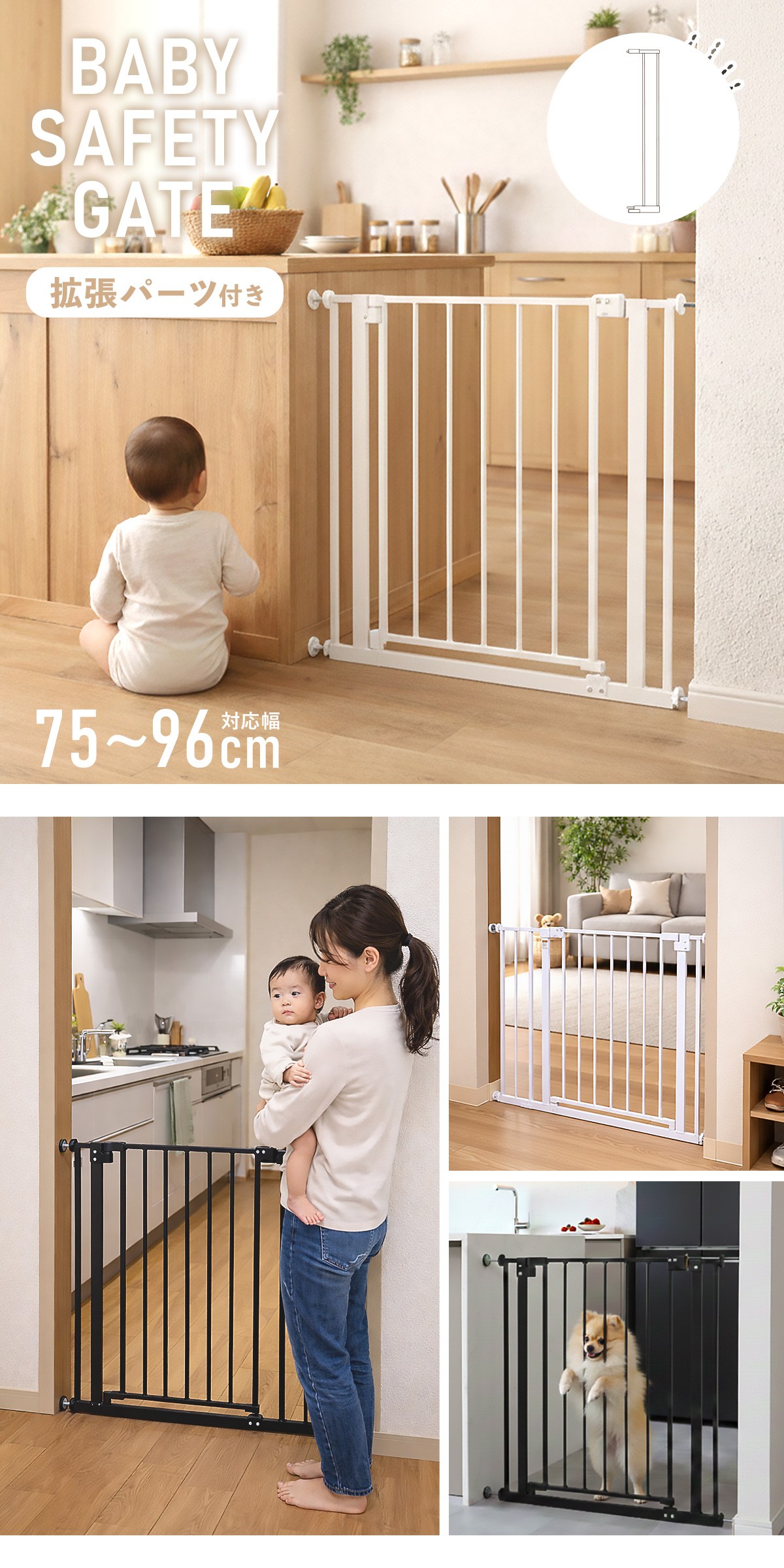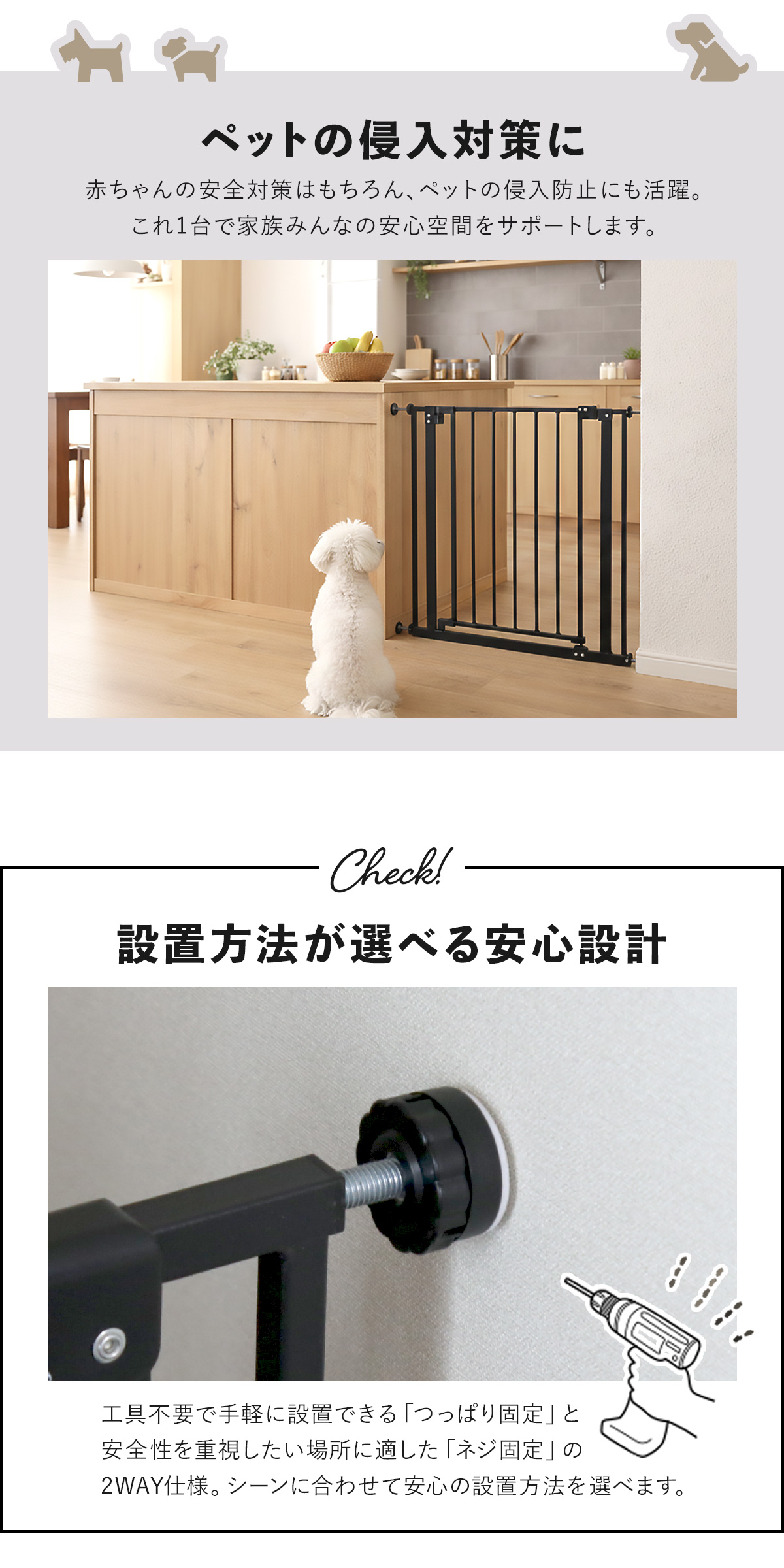 好奇心いっぱいの時期でも、不意に扉を開けてしまうリスクをしっかり抑えます。セーフティゲートに求められるのは、“もしも”を防ぐこと。ロックが二重になっていることで安全性がさらに高まり、階段や玄関など特に注意したい場所にも安心して設置できます。