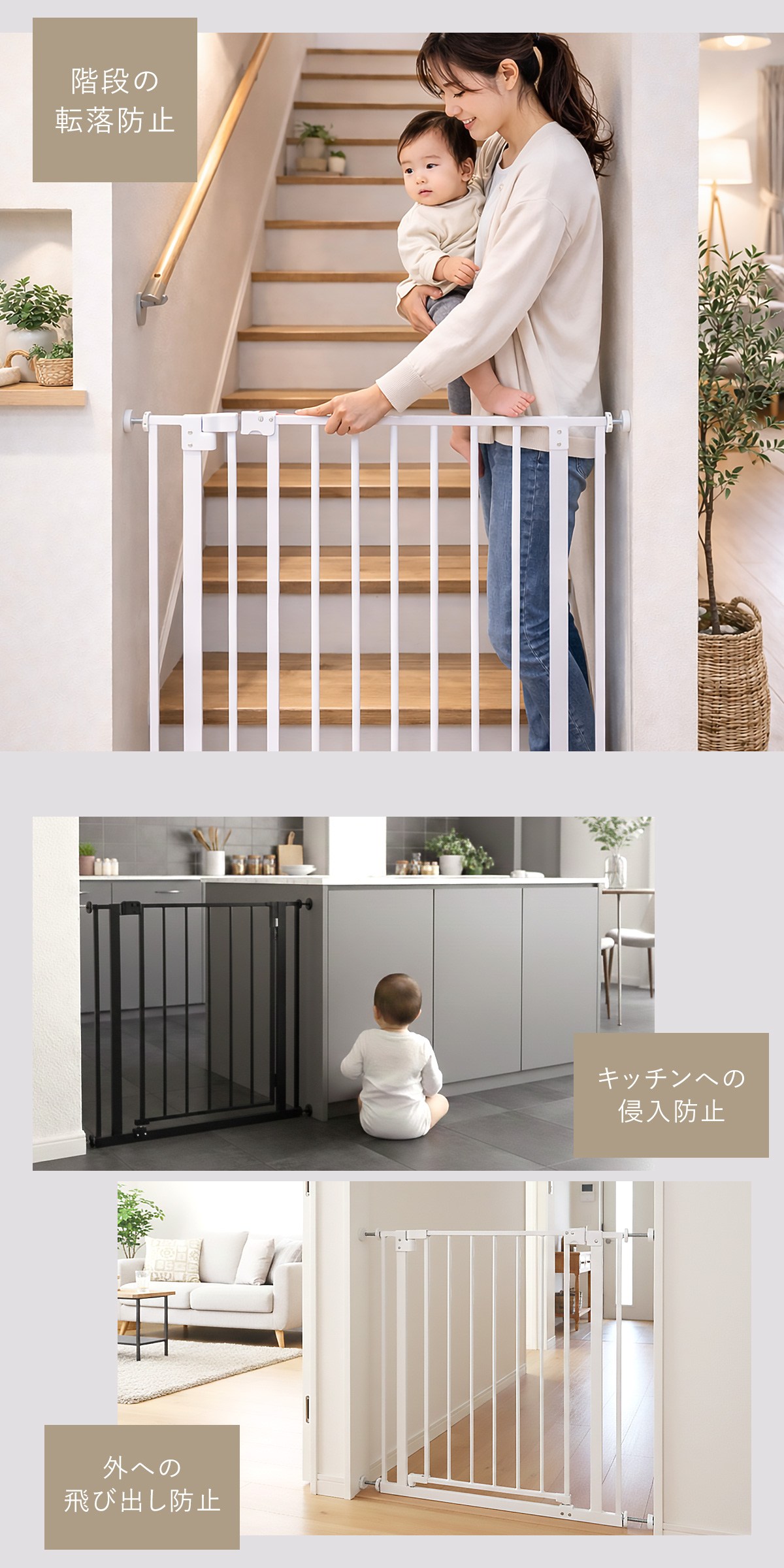 お家の中で最もベビーゲートが活躍するのは、階段・キッチン・玄関。住まいの中でも事故リスクの高いこれらの場所に設置することで、赤ちゃんの行動範囲をやさしくコントロールします。転落が心配な階段上・階段下はもちろん、火や刃物を扱うキッチン、急な飛び出しが不安な玄関前にゲートを設置するだけで、日常の安心感が大きく変わります。生活動線を妨げにくい設計なので、赤ちゃんの安全を守りながら大人の暮らしやすさにも配慮しました。