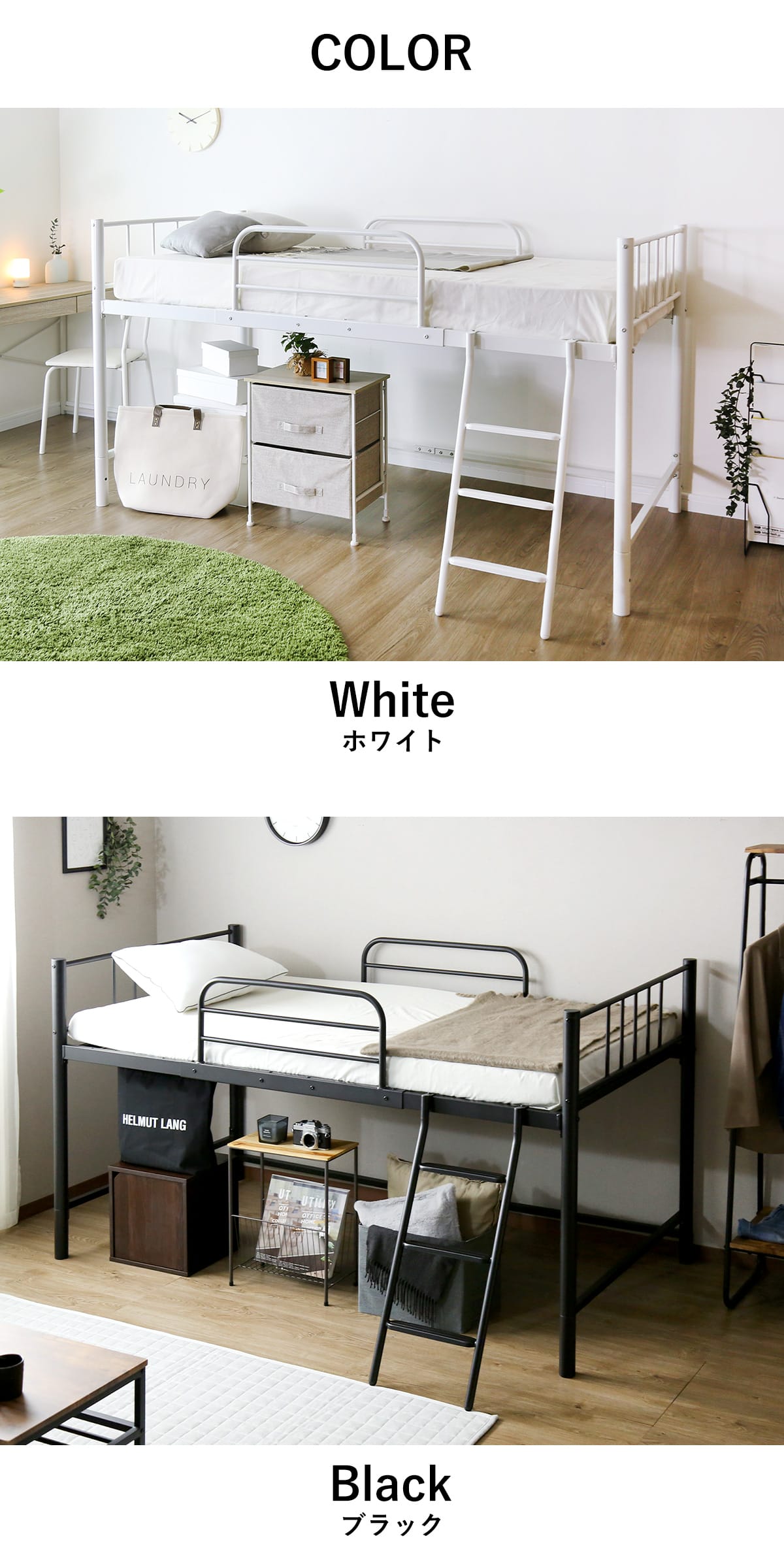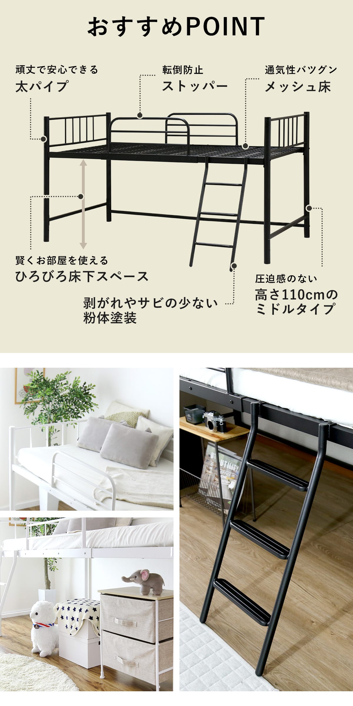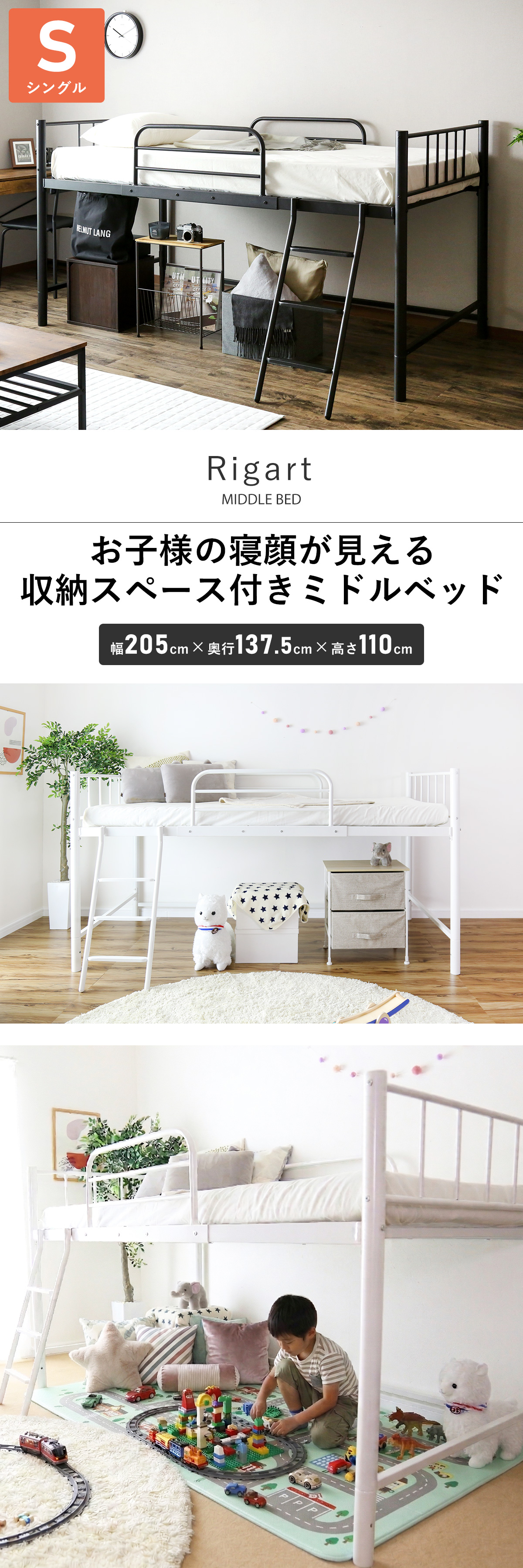 ロフトベッド システムベッド シングル 子供部屋 子供ベッド ミドルタイプ ベッド ベッドフレーム ベッド下収納 パイプベッド リガート
