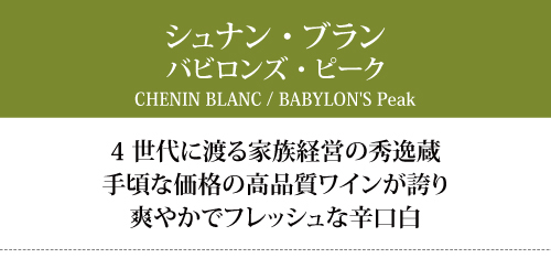 南アフリカの西ケープ州、スワートランドにある「バビロンズ・ピーク」。隠れた谷、田舎暮らし、美しい景色といった言葉が浮かぶ魅力的な環境です。4世代に渡ってバッソン家が、ワイン作りの伝統、情熱、技術を受け継いできました。2003年からは農家でワイン醸造家、マネージャー、苗床管理人と、すべてをこなすステファン・バッソン氏がオーナーとなっています。