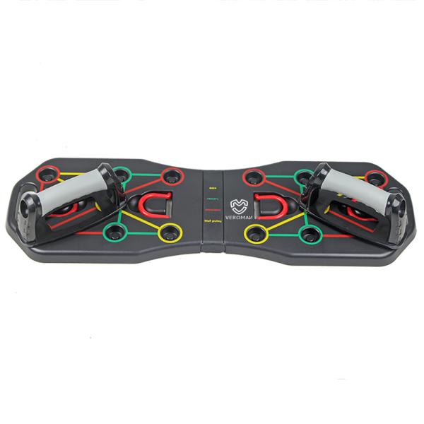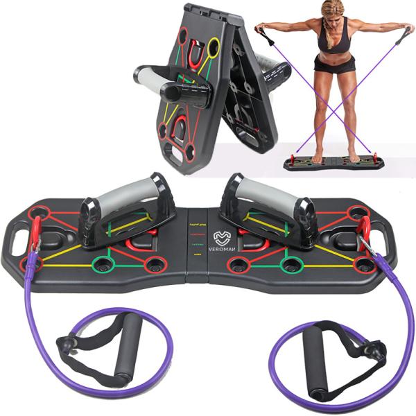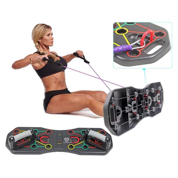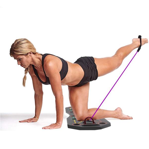 | 特徴 | 1.折りたたみ式で、コンパクトに収納でき、ご自宅やジム、オフィス等どこでも使えます。 2.四色で機能を分けています。(赤い領域/肩、黄色領域/背筋、緑領域/三頭筋、紫色領域/下半身三頭筋) 3.同じ色の穴にプッシュアップバーを当てるだけで正しい姿勢に矯正でき、二つのチューブと合わせてさらに多い筋肉を鍛えます。 |