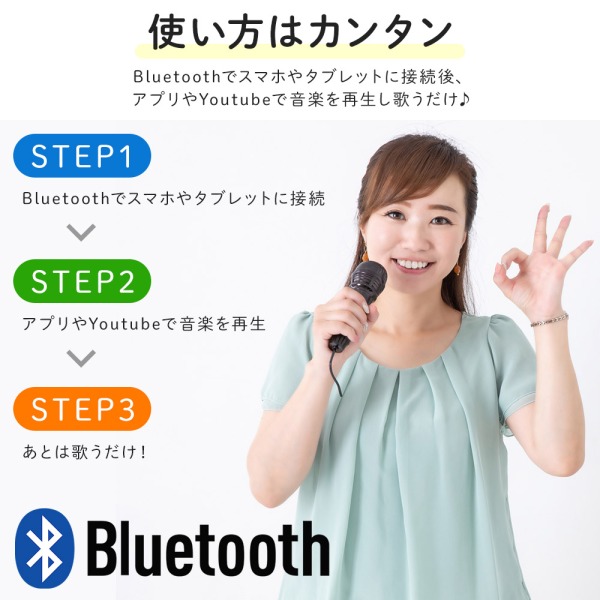 ■Bluetoothでスマホやタブレットに接続後、アプリやYoutubeで音楽を再生し歌うだけ♪