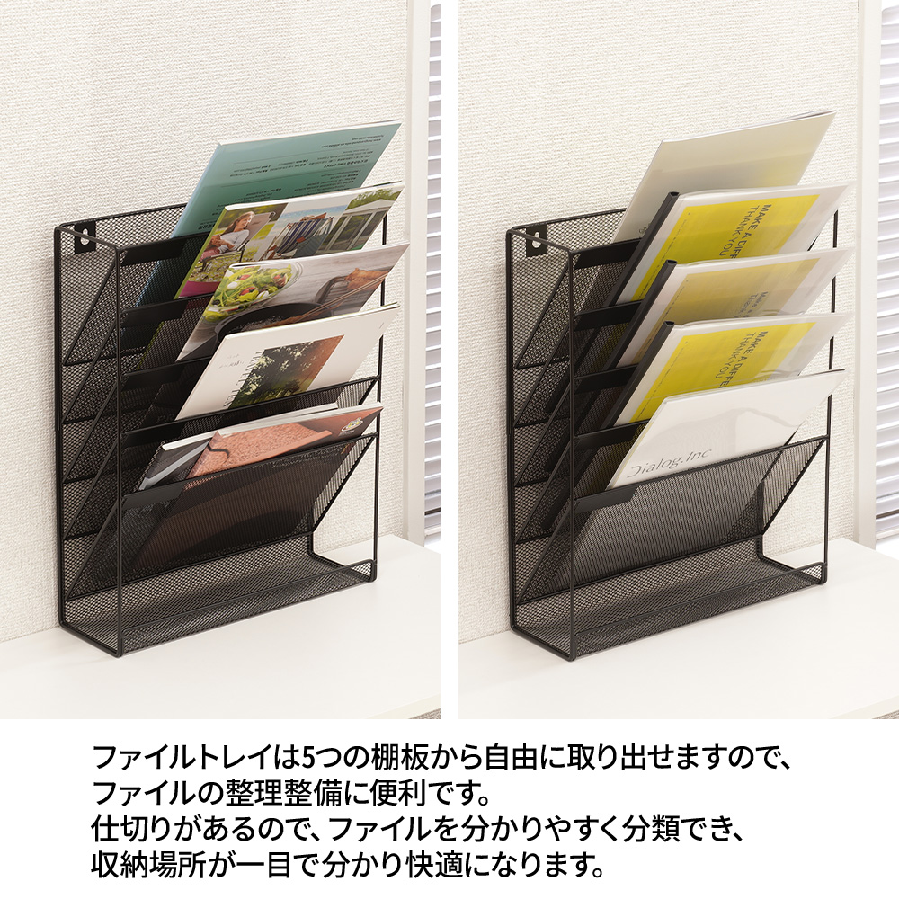 ファイルトレイは5つの棚板がご自由に取り出しますので、ファイルの整理整備に便利です。
