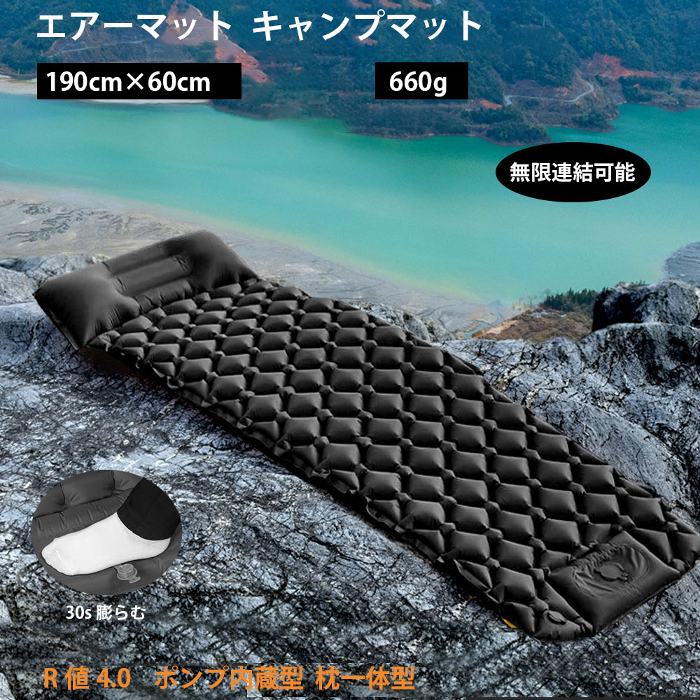 エアーマット キャンプ マット【30s膨らむ・5CM厚さ】足踏み式 無限連結可能 R値4.0 厚手 枕付き 車中泊 防災 超軽量 コンパクト 防水 簡単収納 補修テープ付
