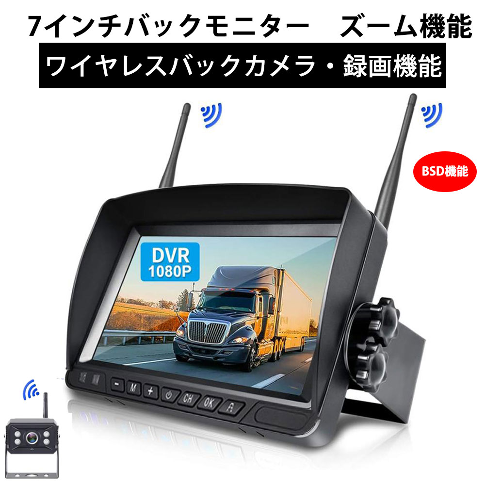 7インチIPSバックモニター ワイヤレスバックカメラモニター HD1080P解像度 録画機能付き 正像鏡像 ガイドライン切替 障害物 BSD警告 分割画面 IP68防水
