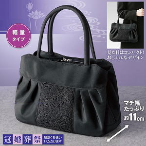 サブバッグは要らない。これ一つで必要な物が全部入る!お悔やみの席でお使い頂ける布製のフォーマルバッグです。見た目はコンパクトなのに大容量。ふくさ、念珠、長財布、老眼鏡、携帯電話、鍵、化粧ポーチ、折りたたみ傘もすっぽり入ります。三層式で小物を仕分け出来るから念珠やふくさなどの必需品もさっと出し入れしやすい。今までのフォーマルバッグでは入りきらなかった荷物もこれ一つにスッキリまとまります。表面は撥水加工を施し生地の裏側はPUコーティング加工で水が中まで染み込みにくい。マチが広いので安定していて倒れません。■サイズ約縦20×横28×マチ11cm※持ち手含む:約縦35cm■本体重量約260g■材質[本体]表地:ポリエステル、裏地:ポリエステル[レース部分]綿、ナイロン、レーヨン■カラー:ブラック■仕様[開閉]ダブルファスナー[三層式]あおりオープンポケット×2(内側オープンポケット×2、ファスナーポケット×1)■生産国:中国製(企画・デザイン:日本) 4995312120330