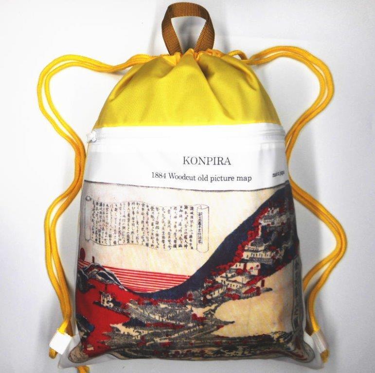 1884年金比羅木版画のレトロ感をデザインにしたナップサックです。(傷、汚れ、等の劣化はレトロ感として、そのまま印刷していますので御了承ねがいます。)