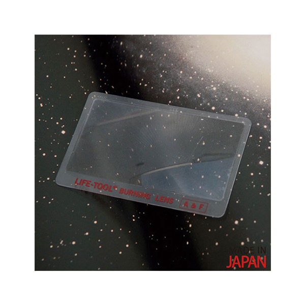 バーニングレンズは球面レンズと同じ効果をもつ名刺サイズの光学フレネルレンズです。拡大鏡としてまたサバイバル時に太陽光を集めて火をおこすことができます。