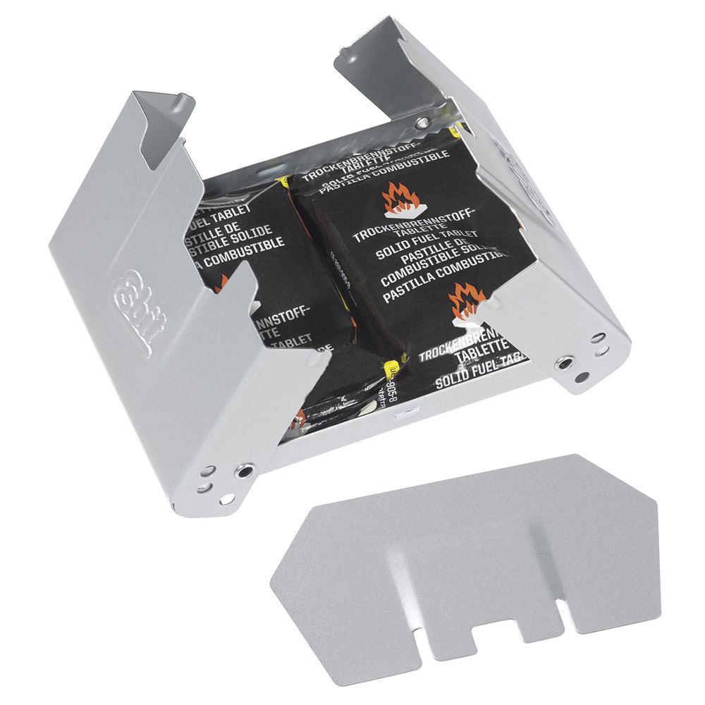 従来のポケットストーブとポケットストーブ ラージの中間サイズです。ウインドシールドが付属し、固形燃料27gが2タブレット付属します。ウインドシールドにより側面の防風性が高まり、固形燃料27gは189kcalと固形燃料のなかで一番高出力です。1タブレットで500mlの水を約5分20秒で沸かすことが可能です。