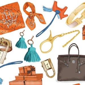 スカーフやバッグ、チャームにキーリングなどをあしらった、個性的なデザインの一枚です。