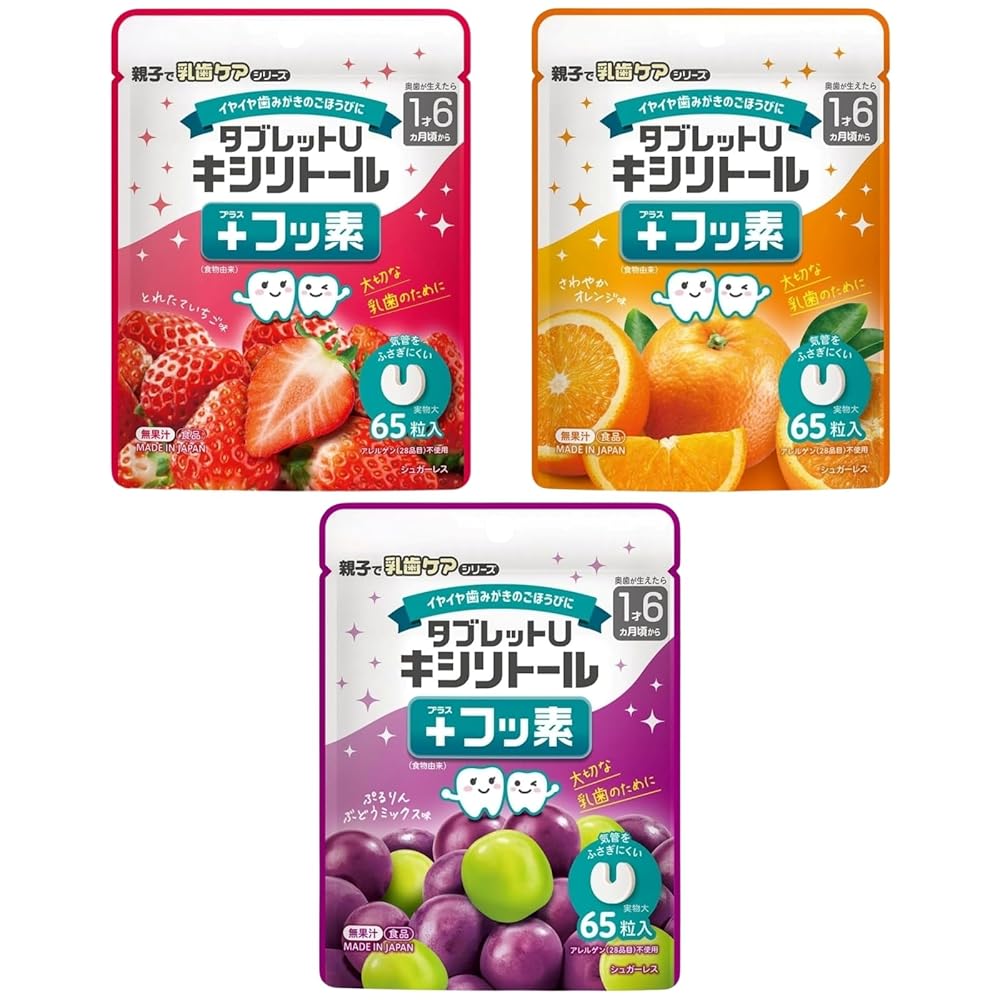 3個セットA 親子で乳歯ケア タブレットU キシリトール+フッ素 65粒入×3個セット ぷるりんぶどう とれたていちご さわやかオレンジ味