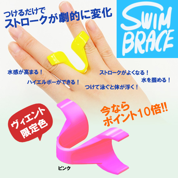 スイムブレースは中指と薬指の間(関節を挟むように)に装着し、外れないように意識しながら使用します。