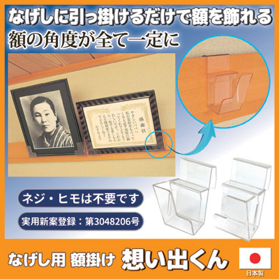 賞状や写真などを、和室にある「なげし」に飾るためのアイデアグッズ。ヒモで吊るしたり、面倒な穴あけなどは一切不要で、本製品をなげしに引っ掛けるだけでセット完了。飾る額の幅に関係なく使用でき、複数枚飾る時に苦労する「額の角度調整」が自動的に一定の角度になる設計。クリアカラーですので、額の色合いも損なうことなく美しく飾ることができます。