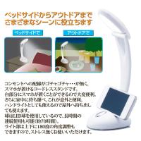 コンセントへの配線がゴチャゴチャ…が無く、スマホが置けるコードレススタンドです。台部分にスマホが置くことができるので大変便利。さらに家中に持ち運べ、これが意外と便利。ハンドライトとしても使えるので屋外へ持ち出しても使えます。球はLED球を使用しているので、長時間の連続使用も可能。(約70時間)ライト部は上下に180度の角度調整もできますので、ストレス無くお使いいただけます。