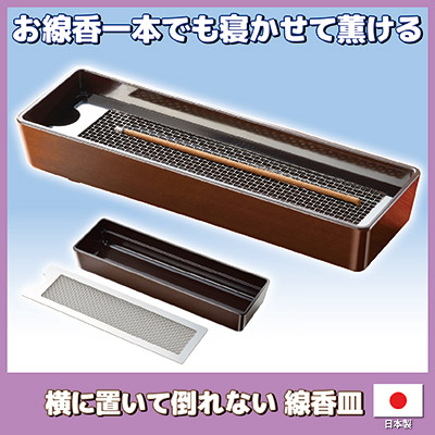 薄型ネットを使用しているので寝かせても線香の火は消えません。お香を楽しむ時や、仏壇での線香立ての代わりとして人気の高い寝かせる線香皿です。従来、線香は立てて火をつけるのが当然のようにしてましたが、近年は寝かすことが俄かに人気が出てます。これは、地震などの揺れや、手が触れてしまい不意に線香が倒れて「火災」に繋がっているケースが多く、その対策としても注目されているからです。器部分はシンプルなカラーリングなので、仏壇周りでも違和感無くご使用いただけます。線香を寝かせて使用するタイプですが、受けるステンレスネットが超薄型なので、線香の火は消えない構造です。リビングや玄関などでの香り用としてもお使いください。