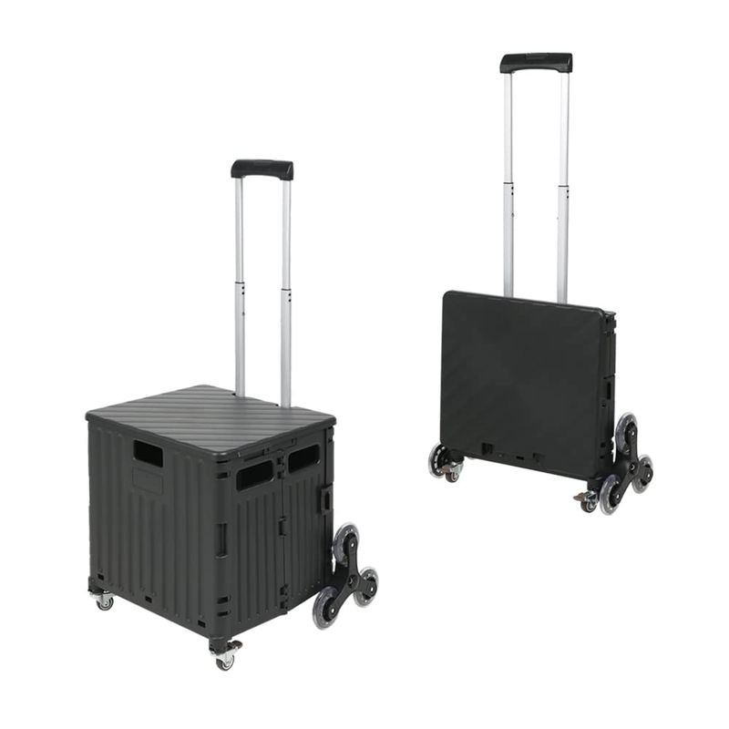 お買い物やアウトドアで活躍する折りたたみキャリーカートです。 折りたたみ式で持ち運びにも便利です。 持ち運びや車への積み込みに便利な持ち手の穴が空いています。 汚れても簡単にお手入れできるプラスチック製です。