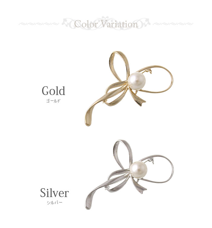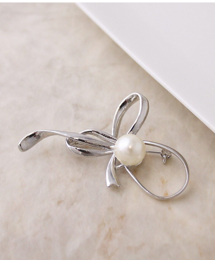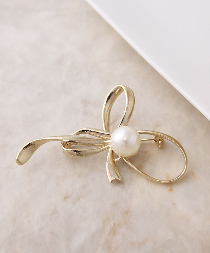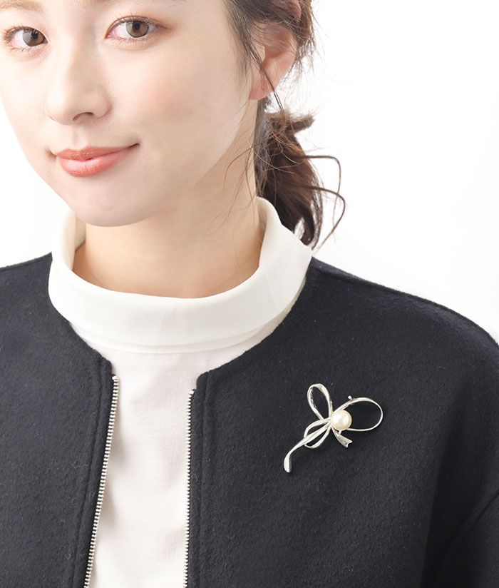 動きのある流れるようなシルエットが印象的なリボンモチーフのブローチ。一粒のパールを添えることで、胸元がより女性らしく華やかな印象に仕上がります。一点投入でシンプルな服装もぐっと洗練されるので、普段使いはもちろん、特別な日のお出かけにもお勧め。