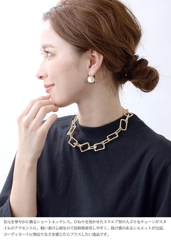 首元を華やかに飾るショートネックレス。ひねりを効かせたスクエア型の大ぶりなチェーンがスタイルのアクセントに。軽い着け心地なので長時間着用しやすく、抜け感のあるシルエットが完成。コーディネートに物足りなさを感じたらプラスしたい逸品です。