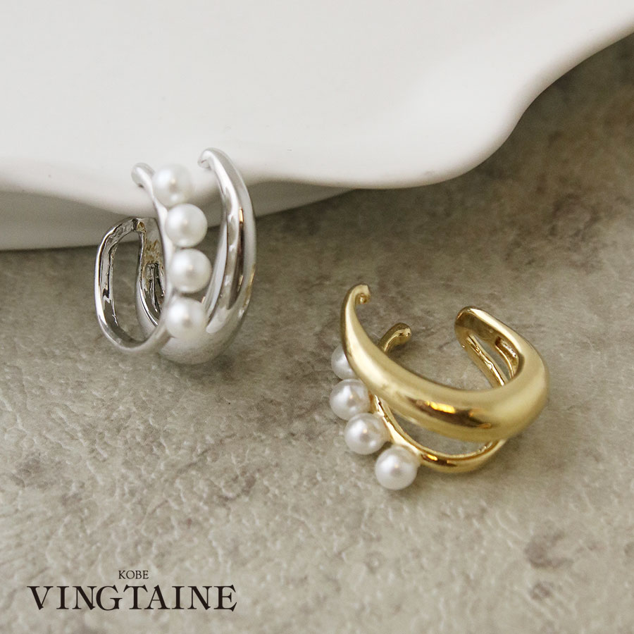 程よいボリューム感がお顔まわりに華やかさをプラスしてくれるイヤーカフ。パールとメタルの2連風のデザインでこれ一つでお洒落なレイヤードスタイルが完成♪カジュアルからキレイ目まで幅広いスタイルに対応してくれます。